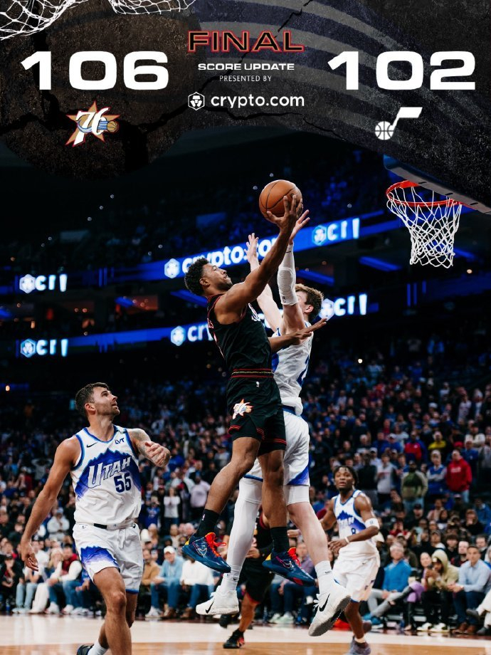 在连续输给绿军和马刺这两支强队之后,76人今天在主场以106-102战胜爵士,终结了两连败,同时也送给爵士7连败。76人战绩来到34胜28负,继续排在东部第六。爵士则以18胜44负的战绩继续排在西部倒数第二。76人今天上半场一度领先到14分,虽然下半场被爵士抹平分差,但最后还是有惊无险地拿到了胜利。