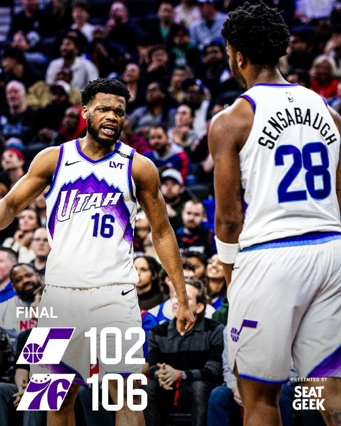 在连续输给绿军和马刺这两支强队之后,76人今天在主场以106-102战胜爵士,终结了两连败,同时也送给爵士7连败。76人战绩来到34胜28负,继续排在东部第六。爵士则以18胜44负的战绩继续排在西部倒数第二。76人今天上半场一度领先到14分,虽然下半场被爵士抹平分差,但最后还是有惊无险地拿到了胜利。