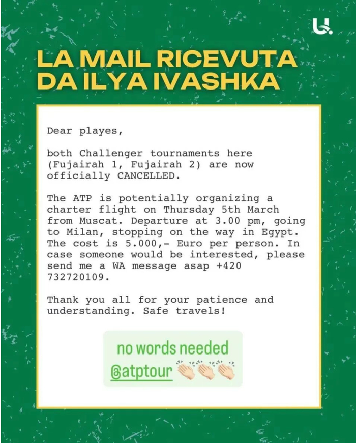 就在所有人都在期待ATP的表态,以及这件事的最终走向时,球员伊利亚·伊瓦什卡通过个人社交媒体第一时间对外透露,所有球员的抗争和外界为滞留球员的发声赢得了全面胜利,撤离中东包机费用事件画上了句号,结果让所有人都很满意。