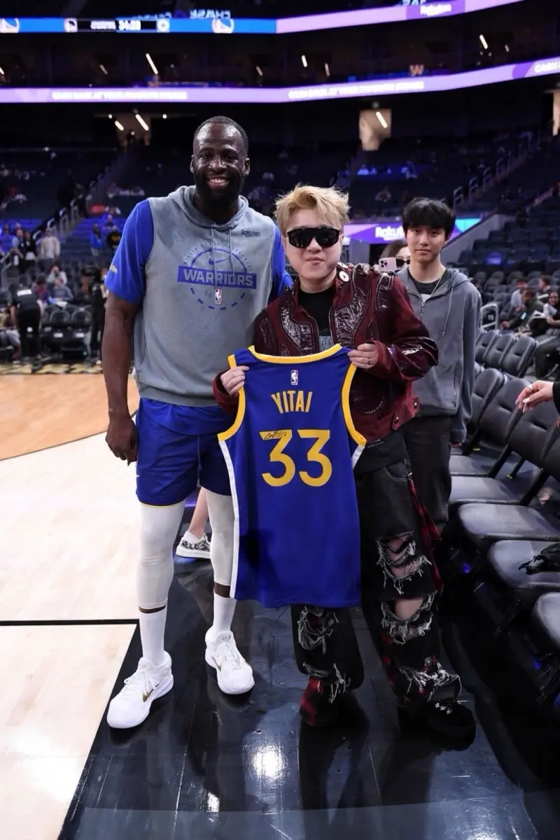 赛前,德雷蒙德-格林与中国说唱歌手王以太握手致意,并在其获赠的专属球衣上留下签名。